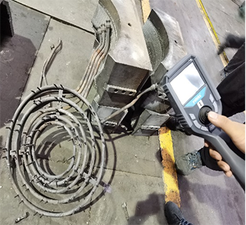 客戶現場主要看輪轂磨具內部通道的堵塞、脫落、毛刺情況,管通道孔徑13mm, 呈環(huán)狀分布,進口5cm的位置,有雙向的分支通管,亞泰光電MIE高清系列內窺鏡的探頭進入導管后,需要分別從兩端進入,本次演示時,沒有2.8mm360°轉向的演示設備,需要手動旋轉管線,預判轉向方位,清晰度方面客戶對MIE內窺鏡非常認可。導管內部多處焊接的位置,實測時能明顯看見內部的焊接堵塞,還有部分脫落,放置貨架的模具,內部有大量灰塵、蟲子等多余物。客戶方現場相關負責人表示他們前面找了很久類似的內窺鏡產品,對亞泰光電2.2mm內窺鏡產品效果很認可,當即表示了進一步合作的意向。